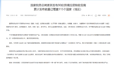 国家税务总局更新发布90份跨境投资税收指南 累计发布数量已覆盖115个国家(地区)