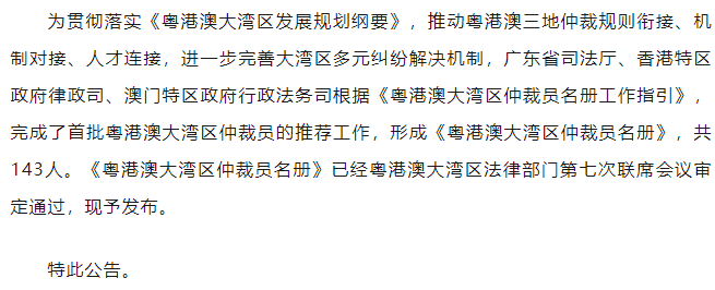 广东省司法厅关于发布粤港澳大湾区仲裁员名册的公告